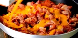 В миске взболтайте яйца и помешивая, вылейте их на грудинку. Когда яйцо начнёт сворачиваться снимите сковороду с огня и добавьте сыр (100 г).