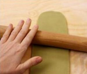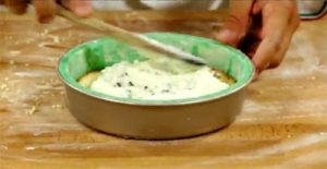 Приготовьте миндальное тесто: смешайте миндальную муку с сахарной пудрой, добавьте фисташковую муку (для чего фисташки надо размолоть в кофемолке и просеять через сито) и несколько капель зелёного красителя. Замешайте тесто, пока оно не начнёт отлипать от стола. Раскатайте его скалкой в полоску, длина и ширина которой равна диаметру и высоте формы, в которой будет собираться кассата.